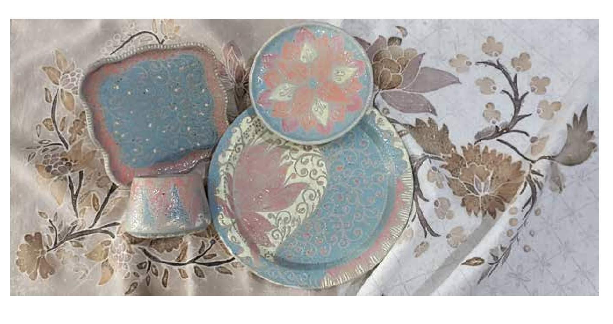 Teknik batik tulis Linen, pewarna alam, keramik, glasir 45 x 45 cm ( 2 kali)