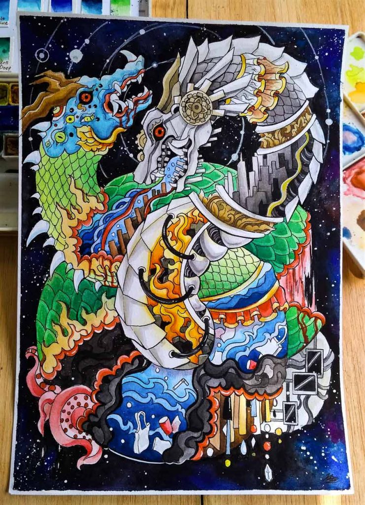 Dua naga yang mewakilkan pertarungan kedua pihak; Alam dan Manusia (dengan teknologi yang dibuatnya), tidak ada yang salah dan benar, atau baik dan jahat, yang ada hanyalah kedua pihak yang berusaha hidup berdampingan. Pihak Buatan mengambil sumber daya dari pihak Alam, menyebabkan Alam, secara harfiah dan simbolis, terluka dan berdarah, terusak dan semakin lama semakin sekarat. Tubuh mereka yang saling terlilit menggambarkan Alam dan Manusia yang keduanya sama-sama berusaha hidup dan dalam berbagai hal, tergantung satu sama lain.